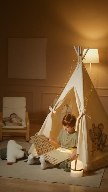 A cozy reading environment is essential for engaging children with bedtime stories․ Dim soft lighting, comfortable seating, and minimal distractions create a calming atmosphere․ Ensure the room is quiet and free from electronic interruptions․ Use pillows, blankets, and warm tones to make the space inviting․ Position yourself close to your child to foster a sense of closeness․ Consider the child’s preferences, such as favorite stuffed animals or blankets, to personalize the setting․ A well-prepared environment helps children focus on the story, making the experience more enjoyable and memorable․ This setup also encourages a love for reading and quality bonding time․